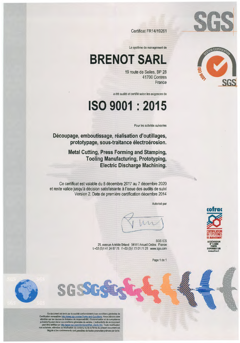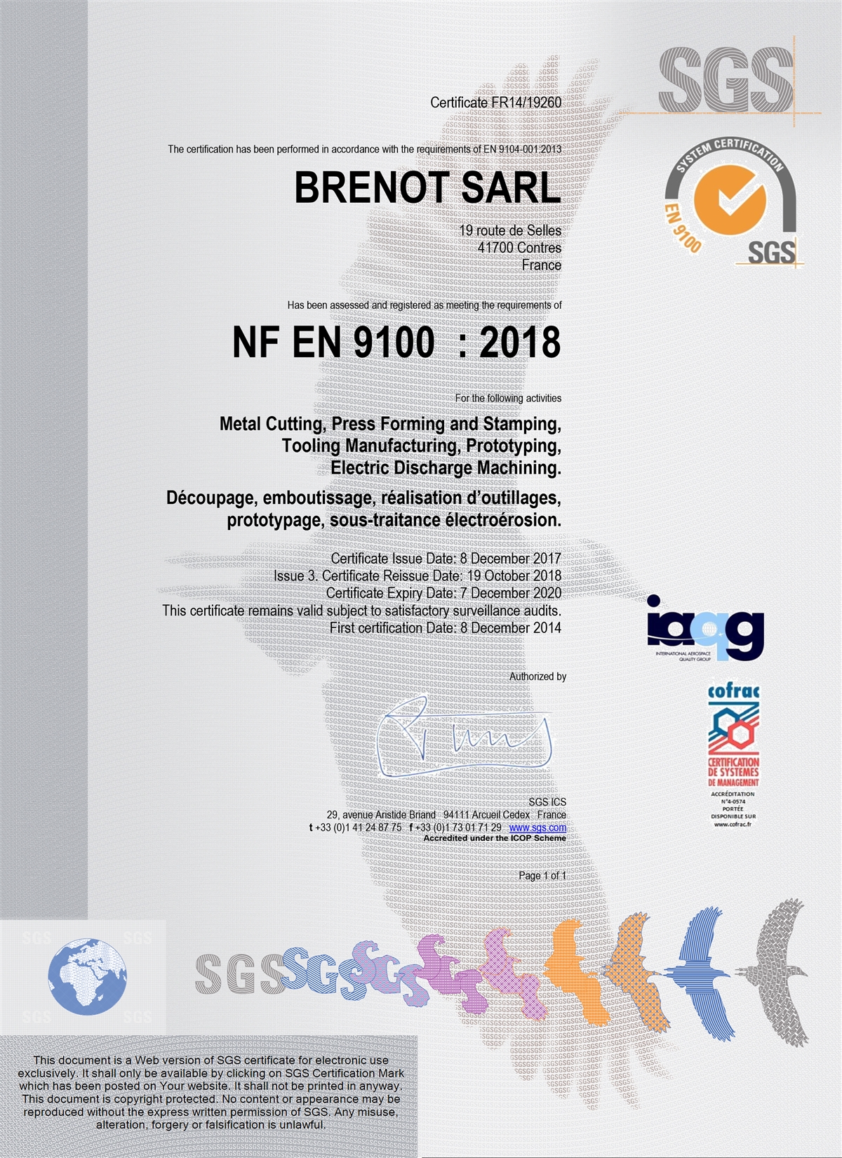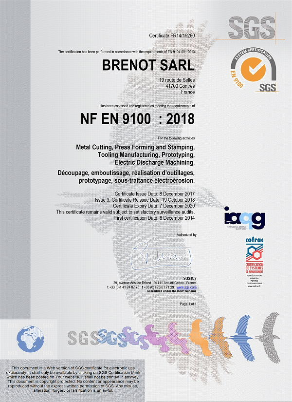 qualité & certificationsDepuis 2005, nous avons fait le choix de passer le processus de certification selon ISO 9000. Nous avons par la suite fait le nécessaire pour faire évoluer nos processus, afin de respecter les standards préconisés par la norme ISO 9000:2008. La qualité est présente dans chaque process, de la revue de commande à l'expédition : Un stock matière qualifié et totalement traçable, des gammes de fabrication et de contrôle standardisées, un suivi de production entièrement informatisé, des outils de finition de pointe, et un espace métrologie dédié. Par ailleurs, nous sommes reconnus et agréés par certains des principaux donneurs d'ordre du secteur aéronautique/défense : Dans ce cadre nous avons fait le nécessaire pour pouvoir répondre aux exigences administratives inhérentes à la norme EN9100. Nous sommes en mesure de fournir des déclarations de conformité conformes aux standards en vigueur dans le secteur, et nous avons la possibilité de fournir des Dossiers Premier Article (FAI, ou First Article Inspection) selon la norme EN9102. Par ailleurs, nous recevons regulièrement nos clients pour des audits Qualité, et à ce titre nous sommes aujourd'hui référencés chez :